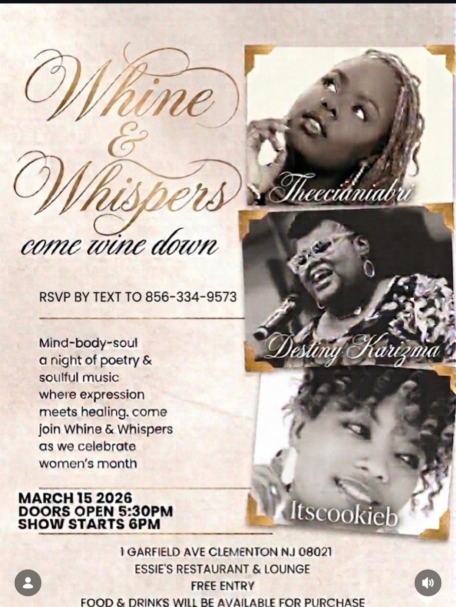 Come Wine Down….. Mind Body & Soul, A Night Of Poetry & Soulful Music where Expressions meets Healing. Come Join Whine & Whispers As we Celebrate Women’s Month. Doors Open 5:30, Show Starts At 6PM. No Cover
